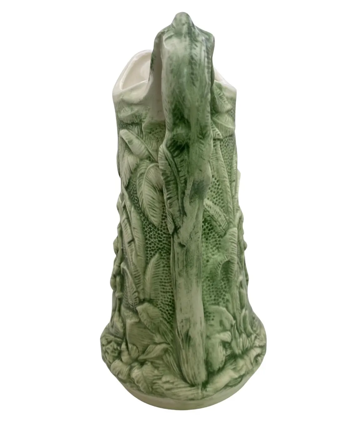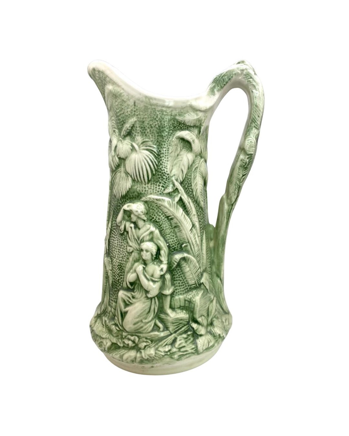 The pitcher showcases a beautifully high-relief molded scene of the novel’s protagonists, Paul and Virginia, set within a lush tropical landscape filled with graceful palm trees and rich foliage. The raised detailing adds depth and texture, giving the piece a sculptural quality that stands out on a shelf, mantel, or display cabinet.