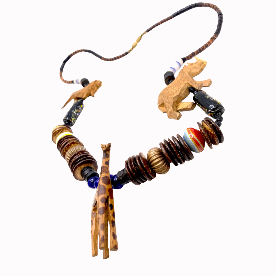 Celebrate bold, earthy style with this handmade African-themed statement necklace, featuring beautifully hand-carved wooden animal beads including a giraffe, rhinoceros, and lion. Each element adds character and storytelling, making this piece a true conversation starter.